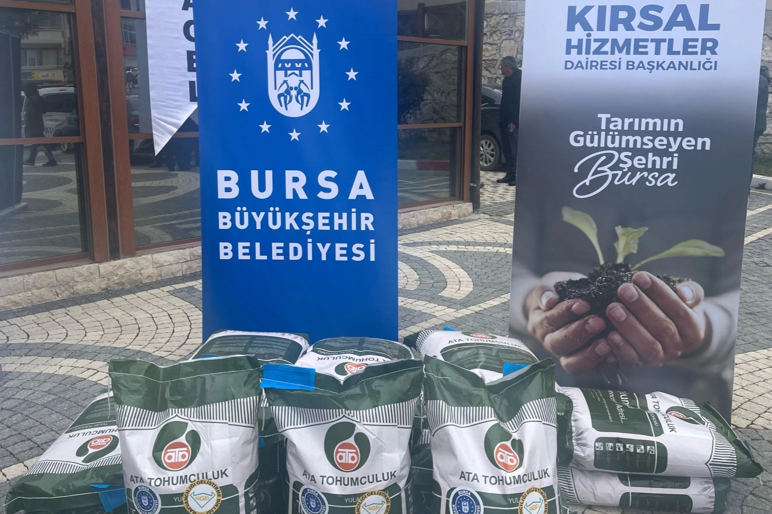 BURSA (İGFA) - Bursa’da fidan ve tohum temininden sulama borusu üretimine, ekipman desteğinden ürünlerin satış ve pazarlamasına kadar her alanda çiftçilere katkı sunan Büyükşehir Belediyesi, son olarak Kırsal Hizmetler Dairesi Başkanlığı, Bursa İli Hayvancılığı Geliştirme Birliği (HAGEL), Harmancık Belediyesi ve İlçe Tarım ve Orman Müdürlüğü iş birliğiyle üreticilere ‘Aspir Yulaf Tohumu’ dağıttı.