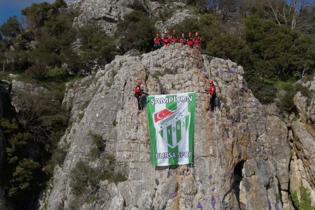 Tatbikatın ardından zirveye ulaşan ekipler, Bursaspor bayrağını açarak anlamlı bir mesaj verdi.