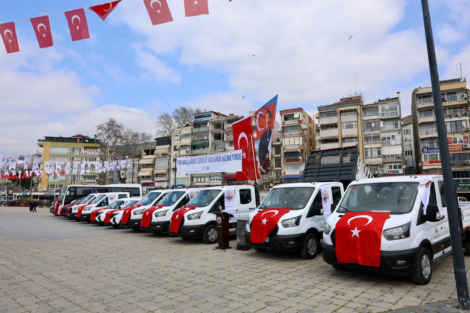 Yeni hizmet araçları, Gemliklilerin incelemesi için İskele Meydanı'nda sergilendi. Filoda kamyonet, minibüs ve arazi araçları bulunuyor.