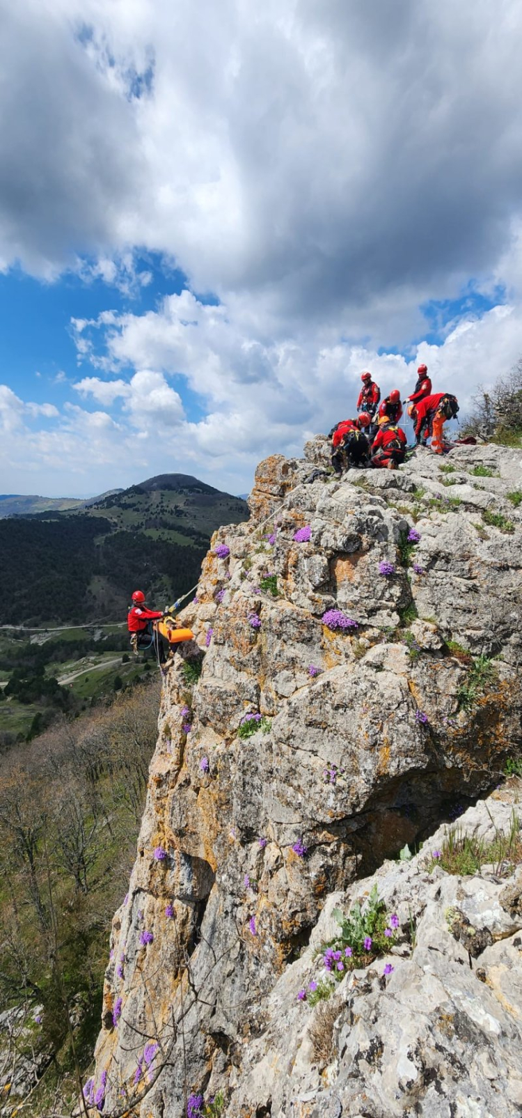 Zorlu arazi şartlarında gerçekleştirilen tatbikatta, kayalık alanda mahsur kaldığı senaryolaştırılan yaralı kısa sürede tespit edilerek ekiplerin koordineli çalışmasıyla bulunduğu noktadan güvenli şekilde kurtarıldı.