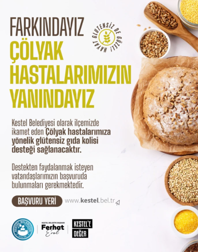 Kestel Belediyesi, sosyal belediyecilik anlayışı doğrultusunda ilçede yaşayan çölyak hastası vatandaşlara yönelik destek çalışmalarını devam ediyor. Bu kapsamda Kestel Belediyesi, çölyak hastalarının sağlıklı ve güvenli gıdaya erişimini desteklemek amacıyla glütensiz gıda kolisi desteği sağlıyor.