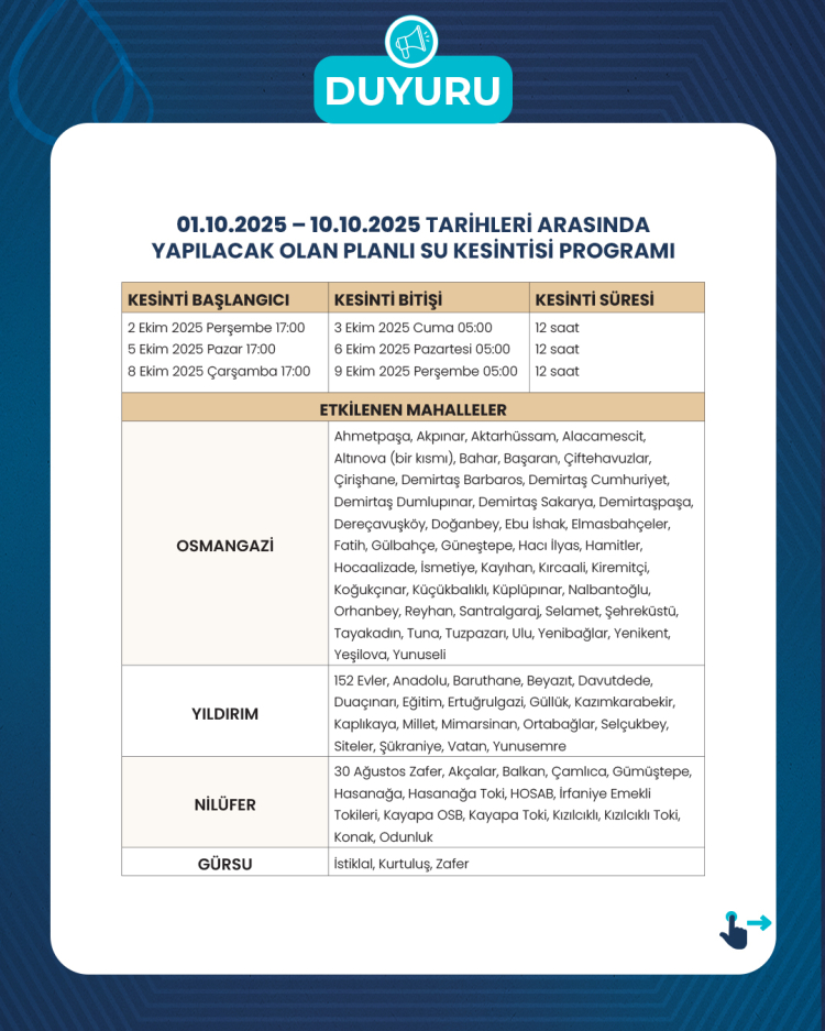 Planlı su kesintilerinden, Uludağ Üniversitesi, Şehir Hastanesi ve Devlet Hastaneleri etkilenmeyecektir. Planlı su kesinti listesi ekte sunulmuştur” denildi.