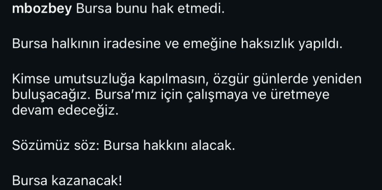 " Bursa bunu hak etmedi. Bursa halkının iradesine ve emeğine haksızlık yapıldı. Kimse umutsuzluğa kapılmasın, özgür günlerde yeniden buluşacağız. Bursa’mız için çalışmaya ve üretmeye devam edeceğiz. Sözümüz söz: Bursa hakkını alacak. Bursa kazanacak!" dedi.