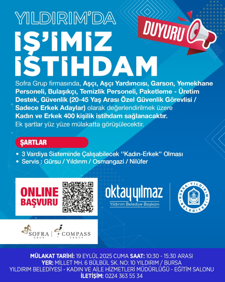 Yıldırım Belediyesi iş arayanlarla iş verenleri buluşturmaya devam ediyor. İstihdam fuarları ve toplu iş görüşmeleriyle binlerce emekçinin istihdama dahil olmasını sağlayan Yıldırım Belediyesi, ‘İşimiz İstihdam Programı’ kapsamında Sofra Grup firmasıyla gerçekleştirilen iş birliği çerçevesinde; Aşçı, aşçı yardımcısı garson, yemekhane personeli, bulaşıkçı, temizlik personeli, paketleme, güvenlik gibi alanlarda 400 kişiye iş imkânı oluşturulacak. Yıldırım Belediyesi’nin internet adresi ve sosyal medya platformlarından online başvuruların devam ettiği projenin mülakat görüşmeleri ise 19 Eylül 2025 Cuma günü 10.00 ve 15.30 saatleri arasında Yıldırım Belediyesi Kadın Aile Müdürlüğü Eğitim Salonu’nda gerçekleştirilecek.